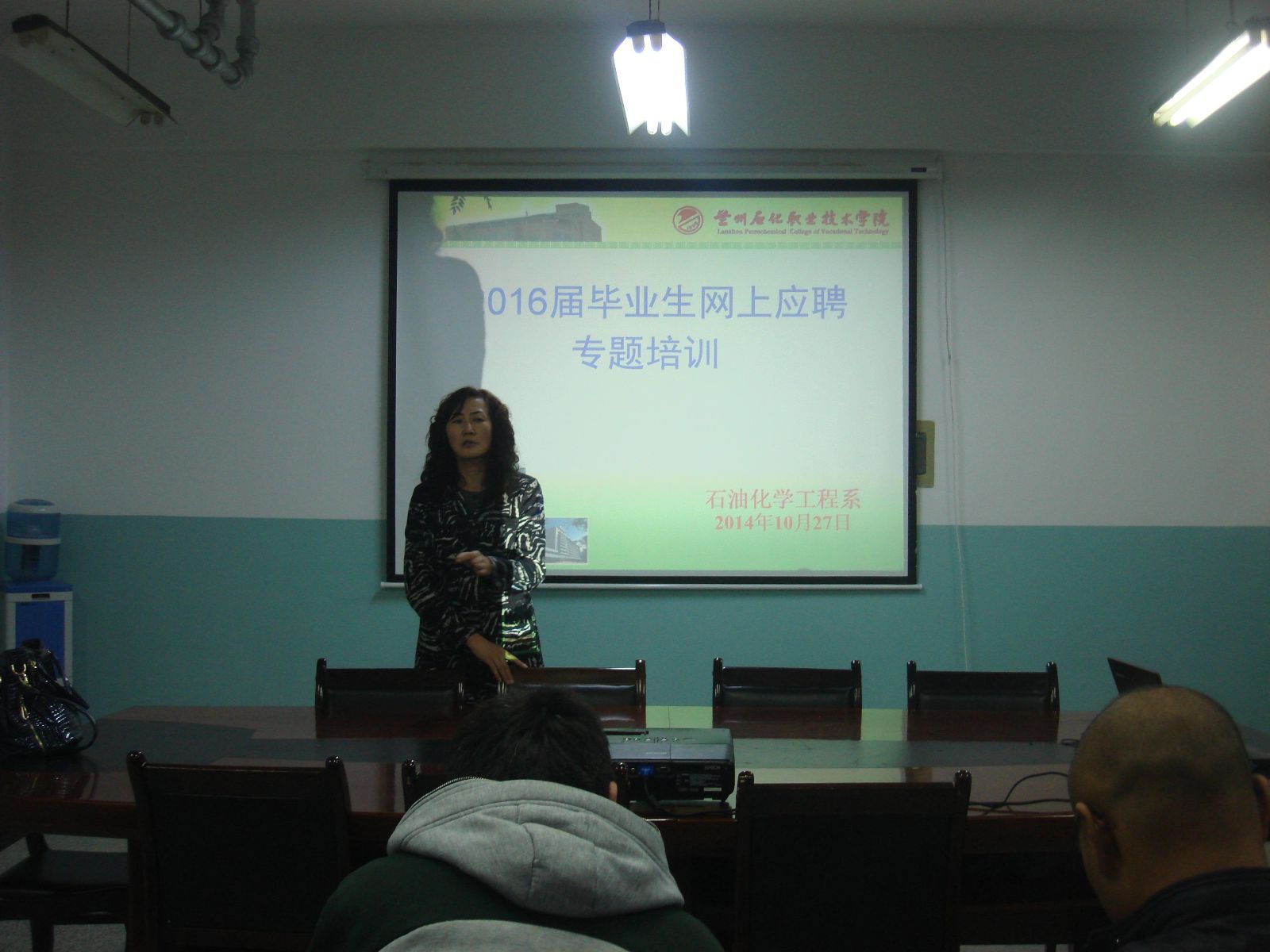 为了拓宽同学们的就业渠道,满足越来越多公司网上招聘的要求,使同学们更加充分地为就业做好准备,10月27日晚,石油化学工程系于石化楼开展了2016届毕业生网上应聘专题培训。本次培训由系党总支副书记唐蓉萍主持,13级各班班委共计60人余人参加了本次培训会。