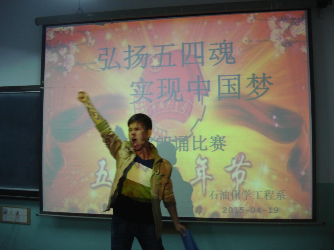 为丰富大学生第二课堂,增强爱国主义情怀,深化对中国梦的理解,4月19日晚,石油化学工程系于石化楼207教室开展了以“弘扬五四魂,实现中国梦”为主题的诗歌朗诵比赛。