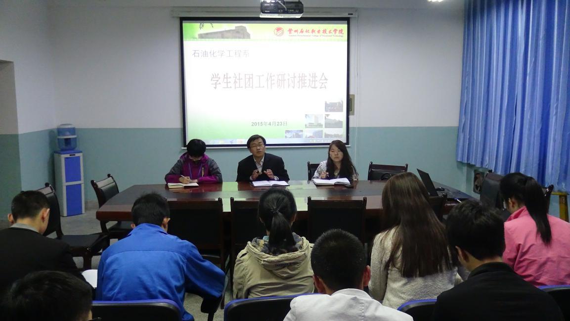 4月23日,在石化楼309会议室开展了学生社团工作研讨推进会,夏德强与社团各部门的负责人从社团工作的重要性、开展社团工作的作用以及社团以后的发展三方面做了社团的工作的研讨,并且针对社团工作遇到的问题进行了指导,从而更好的推进社团的工作。