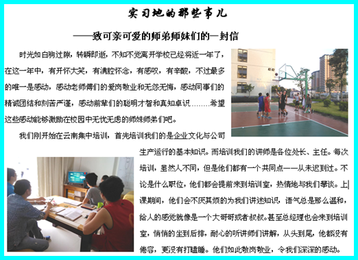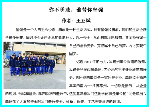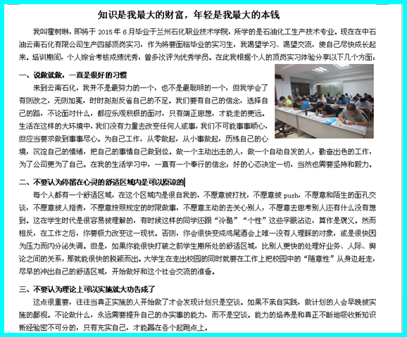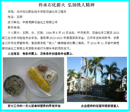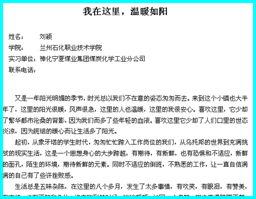 为了进一步了解学生在顶岗实习期间的工作生活、思想现状、心理适应等状况,石油化学工程系于五月份到六月上旬进行了2012级毕业生顶岗实习征文活动。本次征文得到了同学们的积极响应,他们在签约单位或者顶岗实习单位的幸福生活通过笔尖和照片展示出的淋漓尽致,使得广大学生对生活、工作、学习充满了动力和希望。现选取部分做一摘录,让我们共同体验一下他们在奔梦路上的幸福和快乐。