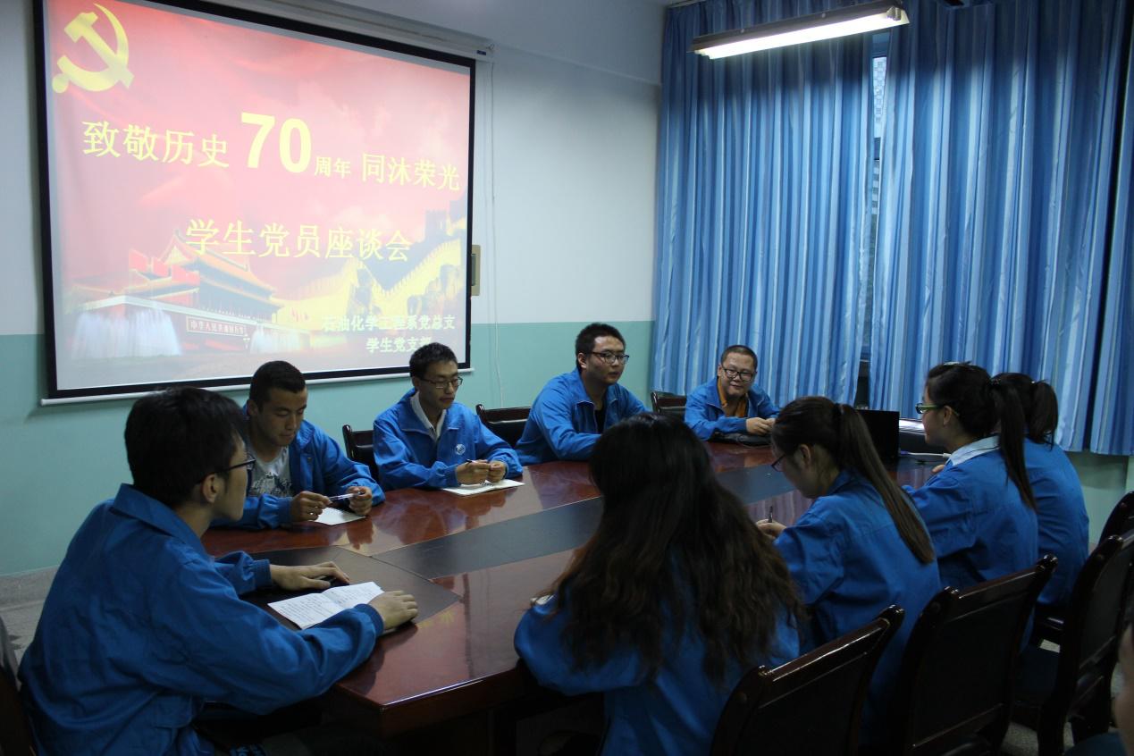 为纪念抗日战争暨反法西斯战争胜利70周年,激发广大学生党员的爱国情怀,石油化学工程系于9月1日下午在化工楼309组织召开题为“致敬历史,同沐荣光”的学生党员座谈会。2013级全体党员参加了座谈。
