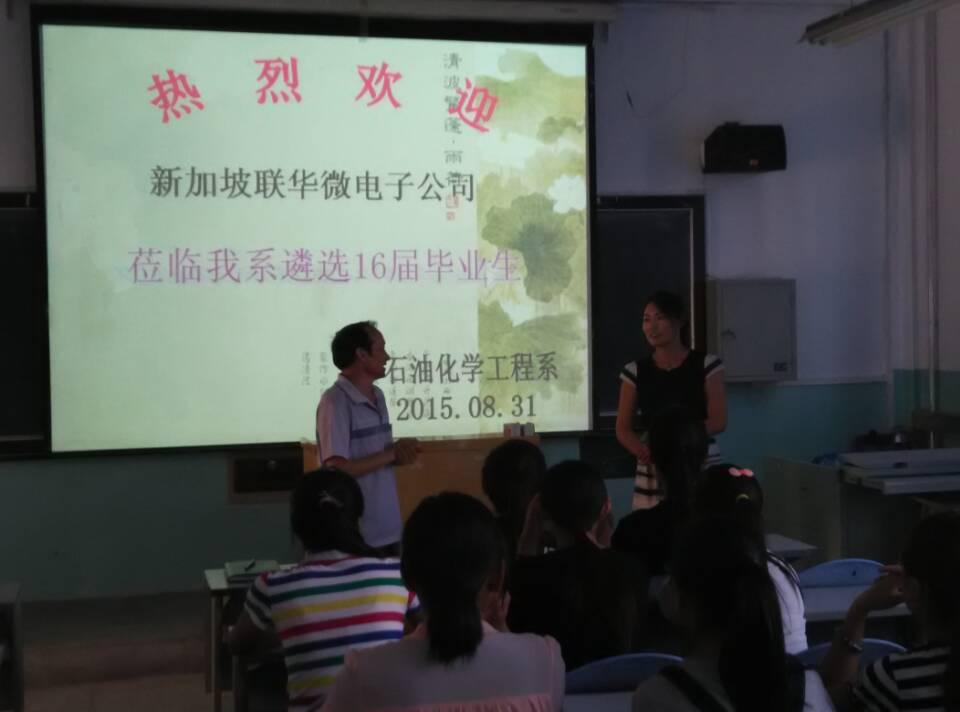 2015年8月31日下午4点,新加坡联华微电子公司人力资源部杨丽女士,到石油化学工程系石化楼201多媒体教室举行了企业招聘宣讲报告会,并有意向遴选2016届毕业生,石化系、应化系、信控系等相关专业的60余名学生参加了招聘会。