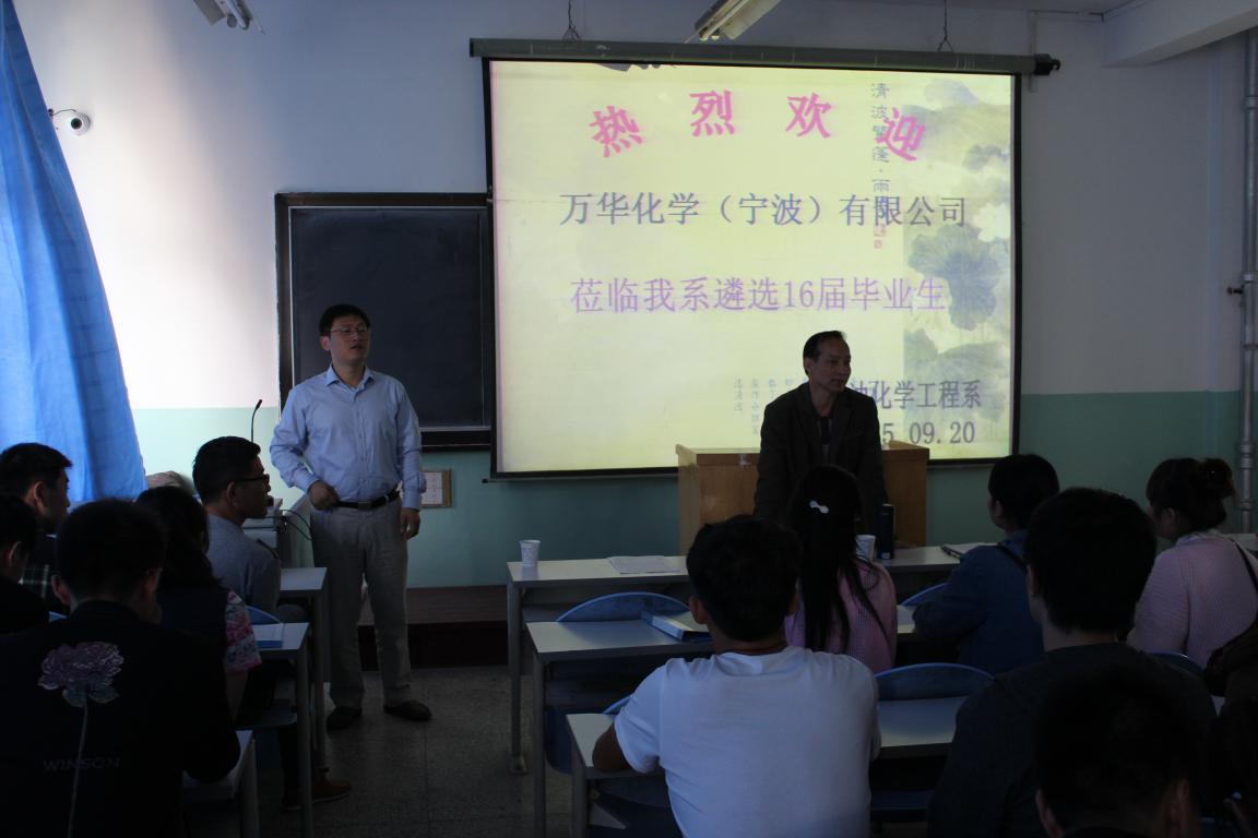9月20日上午,万华化学(宁波)容碱聚氨酯有限公司蔡总经理一行2人到石化楼207多媒体教室举行了企业招聘宣讲报告会,石油化学工程系系领导及石化系、应化系、电子系及机械系等相关专业的100余名2016届毕业生参加了此次报告会。
