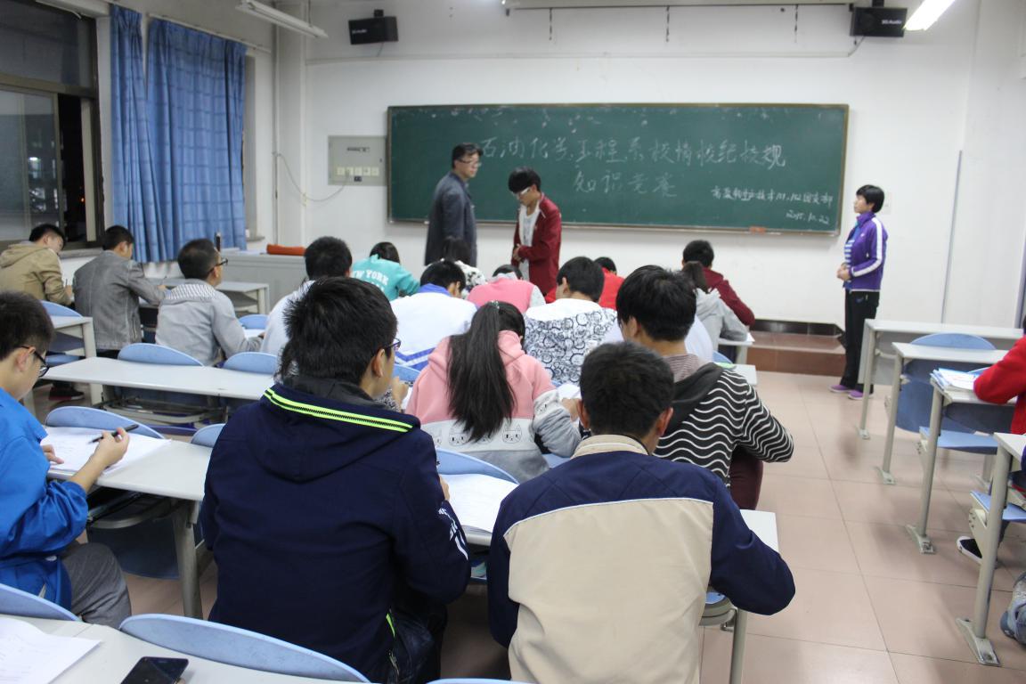 为了促使2015级新生全面了解我院校情、进一步熟悉学院的学风建设和校园文化建设的具体要求和管理理念,全面推动石化系规范性、标准化学生管理,建立学生自我管理素质的特色化发展体系,石油化学工程系于10月22日晚7点半,在2015级各班自习教室开展了“校纪校规”知识竞赛,2015级全体新生参加了此次竞赛,竞赛由各班主任亲自监督,系领导、辅导员对各班级进行了督察。