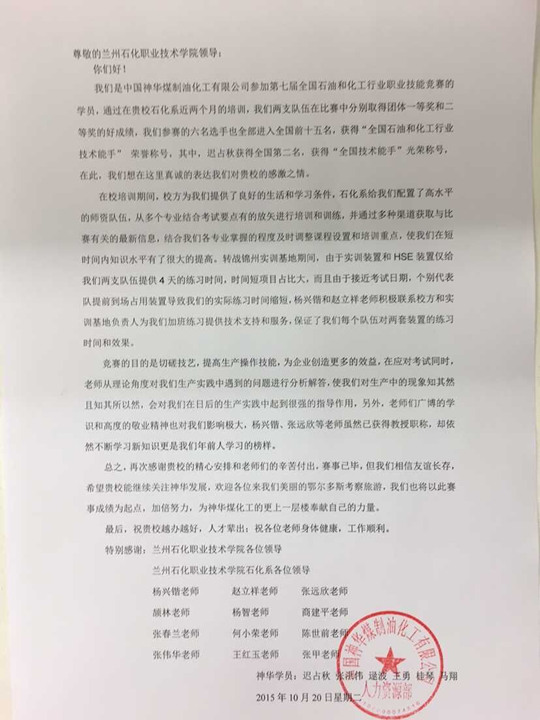 我们是中国神华煤制油化工有限公司参加第七届全国石油和化工行业职业技能竞赛的学员,通过在贵校石化系近两个月的培训,我们两支队伍在比赛中分别取得团体一等奖和二等奖的好成绩,我们参赛的六名选手也全部进入全国前十五名,获得“全国石油和化工行业技术能手” 荣誉称号,其中,迟占秋获得全国第二名,获得“全国技术能手”光荣称号,在此,我们想在这里真诚的表达我们对贵校的感激之情。