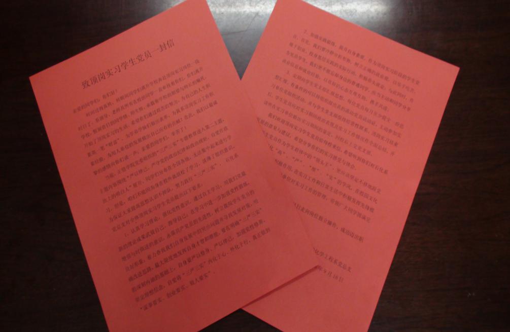一、开展了“给顶岗实习党员一封信活动”。信中,石化系以最诚挚的感情给顶岗实习党员道出:亲爱的党员同学们,你们辛苦了。提出当前正值学院党委组织的“三严三实”专题教育进入第二主题,围绕“严以律己,严守党的政治纪律和政治规矩,自觉做政治上的明白人”。
