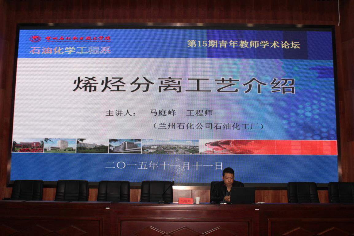 11月11日下午,石油化学工程系、科技处特邀请兰州石化公司石油化工厂石化系优秀校友马庭峰工程师于学院西区多功能报告厅作题为《烯烃分离工艺介绍》的学术报告。石化系师生约300人参加了本次报告会。