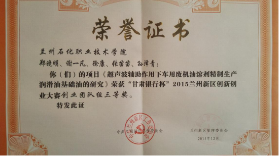 12月27日,由兰州新区党工委、兰州新区管委会、共青团甘肃省委共同主办,市科技局(市创新办)、兰州新区教育科技文化局、兰州新区科技创新发展管理有限公司等单位承办的“甘肃银行杯”2015兰州新区创新创业大赛总决赛在兰州新区产业孵化大厦成功举办。评委专家团由甘肃省科技厅高教处、兰州市科技局、兰州新区创业管理有限公司、甘肃银行兰州新区支行、兰州交通大学科技园等相关单位共12位专家组成。本次创新创业大赛于2015年11月份启动,大赛分企业组和团队组进行角逐,团队组共有118个项目参加了本次大赛,在初赛和复赛中,经12位评委专家对所有创业团队的商业策划书评审打分,最终10个创业团队的项目入围了总决赛,大赛设一等奖1名,二等奖2名,三等奖3名。由我院石油化学工程系郑晓明老师和王守伟老师带队、谢一凡等同学参与的项目《超声波辅助作用下车用废机油溶剂精制生产润滑油基础油的研究》成为入围10强的唯一一个来自高职院校的项目,与北京大学、兰州大学、西北师范大学、兰州交通大学等本科院校创业团队的项目进行了总决赛的角逐。在总决赛上,石化系炼油143班谢一凡同学作为代表对参赛项目进行了讲演和答辩,评委专家一致认为项目的研究意义明确、创业思路清晰、商业运行模式合理,最终排名创业团队组第4名,获得“甘肃银行杯”2015兰州新区创新创业大赛创业团队组三等奖,并获得了1万元的技术研发基金奖励。