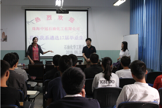 8月25日中午,珠海中冠石化有限公司人事部严经理到我院石油化学工程系遴选2017届毕业生,我院相关专业的26名2017届毕业生到场聆听了此次报告会。石化系党总支副书记唐蓉萍、就业辅导员于爱平等领导参加了此次报告会。