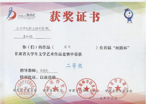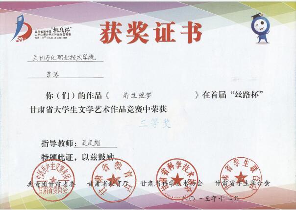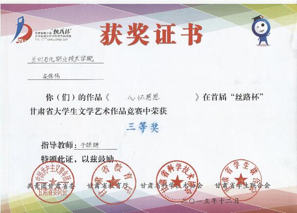 我院学生参加首届“丝路杯”甘肃省大学生文学艺术作品竞赛,喜获佳绩。由石油化学工程系苏宏光老师指导的作品《成长》获得“丝路杯”二等奖、吴良彪老师指导的作品《前世遗梦》、《丝路情深》、《丝路念》获得三等奖、余娇娇老师指导的作品《心怀感恩》获得三等奖。