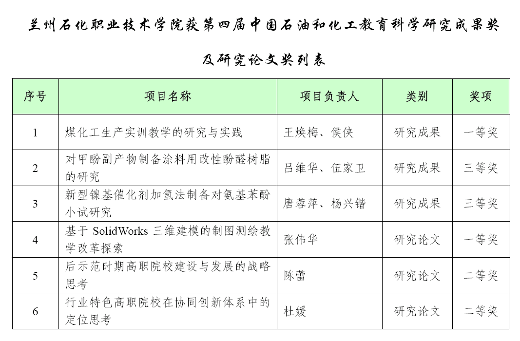 会议宣读了《关于第四届中国石油和化工教育科学研究成果奖评选结果的通知》,与会领导为获奖院校颁发了荣誉证书。我院有6项成果分获科学研究成果一等奖1项、三等奖2项,论文一等奖1项,二等奖2项。