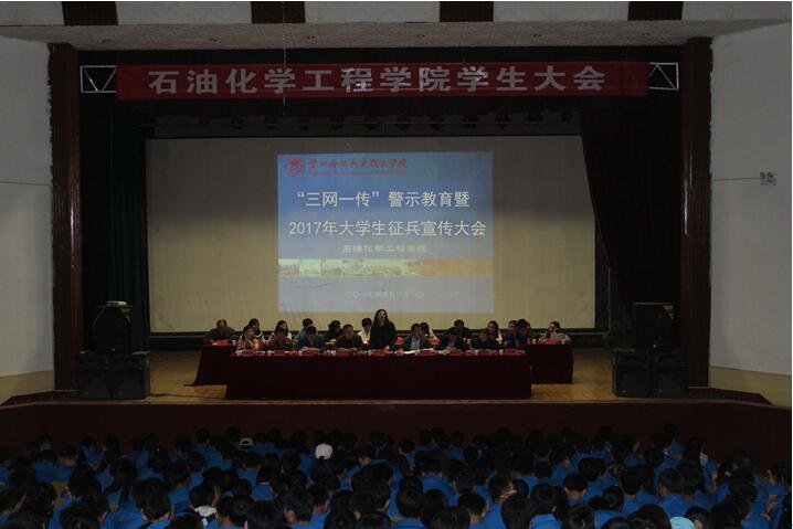 4月21日,石油化学工程学院在西区礼堂召开了校园“三网一传” 警示教育暨2017年大学生征兵宣传大会。此次会议旨在加强学生安全上网管理,避免出现校园网络贷款等现象,同时对大学生征兵进行宣传,学院领导、全体班主任及15、16级全体学生参加了此次大会。