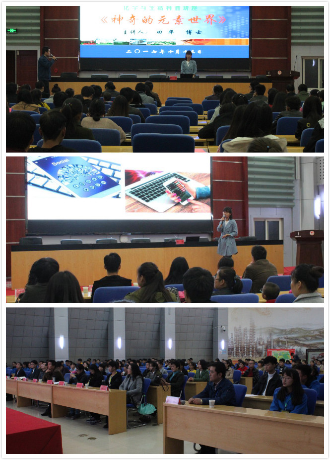 为引导学生认识和理解生活中的化学现象,关注社会和生活中的化学问题,提高基本的科学素养,10月13日下午,赛会还举办了科普报告会,来自全省10所参赛院校代表队全体成员参加了报告会。科普报告会由兰州石化职业技术学院副教授田华博士主讲。田华博士曾获得第二届甘肃省科普讲解大赛二等奖,被授予“十佳科普使者”的荣誉称号。田华博士以《神奇的元素世界》为主题,分别以“锂电池的那些事儿”、“烟花的那些事儿”、“喝酒的那些事儿”三个版块从元素周期表的产生、锂电池的发展及其使用的利弊、元素各种反应的特点与现象以及酒精的危害与利用等方面做了详细的报告。