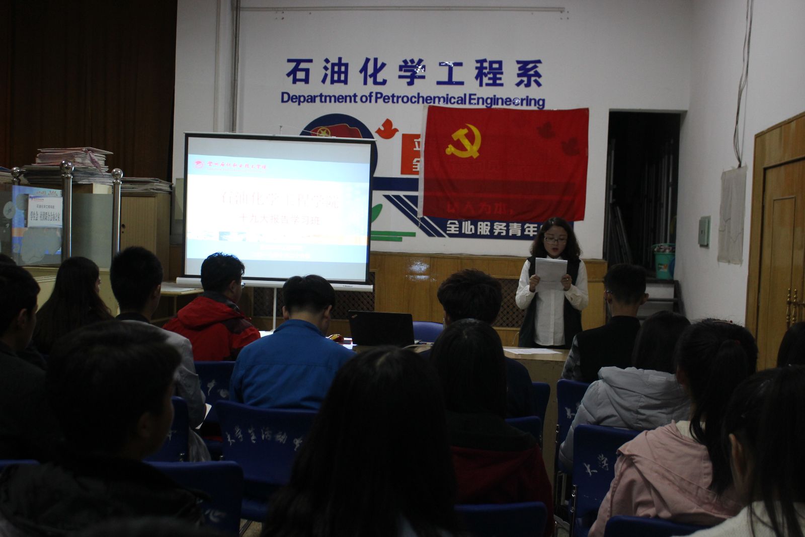 10月26日,石油化学工程学院团总支于大学生活动中心召开了十九大报告学习会议。此次会议由团总支书记席满意主持,团总支、学生会各部门负责人及各班级团支书参加了此次会议。