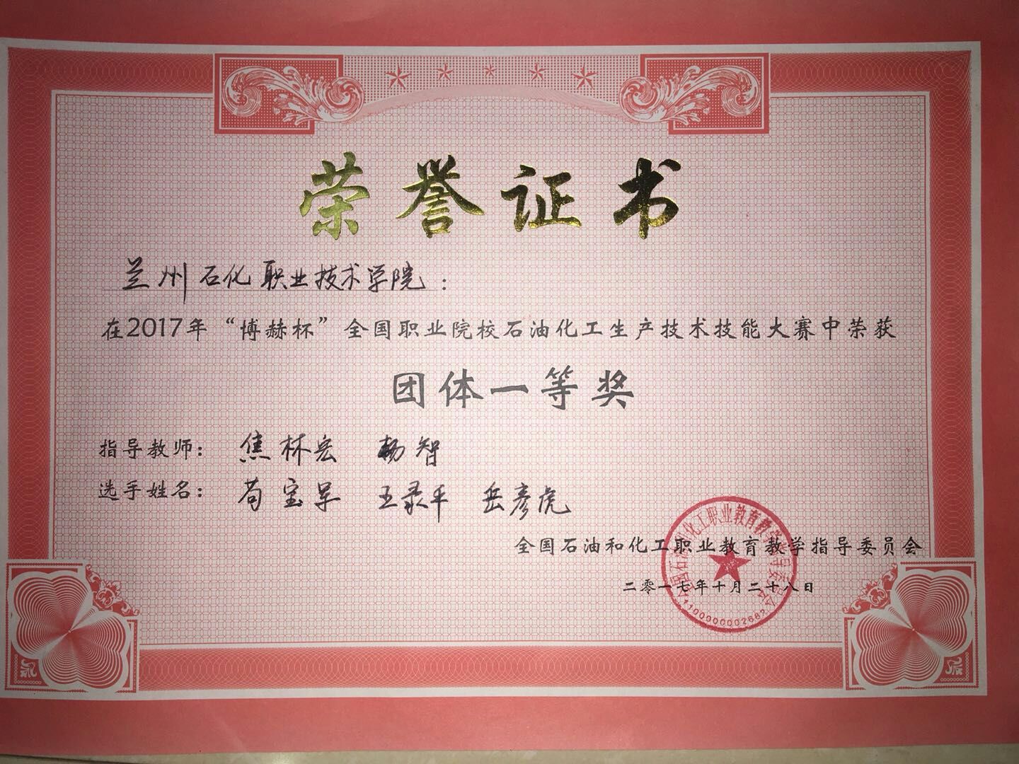 10月27日~30日,由中国化工教育协会、全国石油和化工职业教育教学指导委员会、化学工业职业技能鉴定指导中心主办,石油化工生产技术专业委员会承办,秦皇岛博赫科技开发有限公司协办的2017年“博赫杯”全国职业院校石油化工生产技术技能大赛在秦皇岛博赫科技园举行。我校石油化学工程学院院长助理赵立祥担任领队,焦林宏、杨智为指导教师,王录平、苟宝军、岳彦虎3名学生代表学校参加了此项赛事。参赛选手凭借娴熟的操作技能和敏捷的思维能力,勇夺团体一等奖。三名参赛选手全部获得由化学工业职业技能鉴定指导中心颁发的高级工证书,两位老师被评为优秀指导教师。