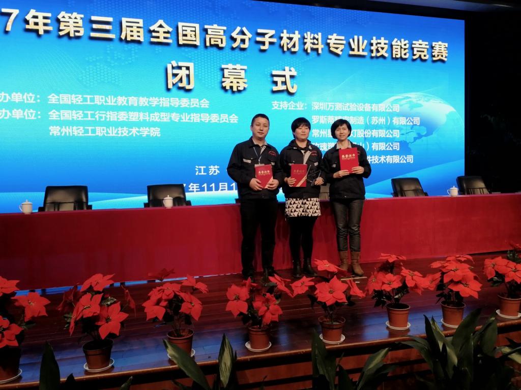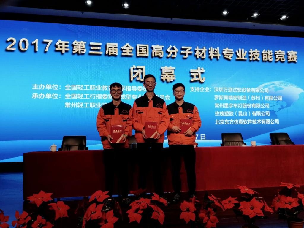 由全国轻工职业教育教学指导委员会主办,全国轻工行指委塑料成型专业指导委员会和常州轻工职业技术学院承办的第三届全国高分子材料专业技能大赛,于2017年11月16日至17日在常州成功举办,全国14所高职院校参加了此项赛事。我校石油化学工程学院代表队勇夺大赛团体特等奖。滕宏、李彦军、蒋双虎3名参赛选手共获得:1个个人全能特等奖, 4个单项特等奖, 1个个人全能一等奖,2个单项一等奖,2个单项二等奖的优异成绩。罗资琴、石星丽、王有朋获优秀指导教师。