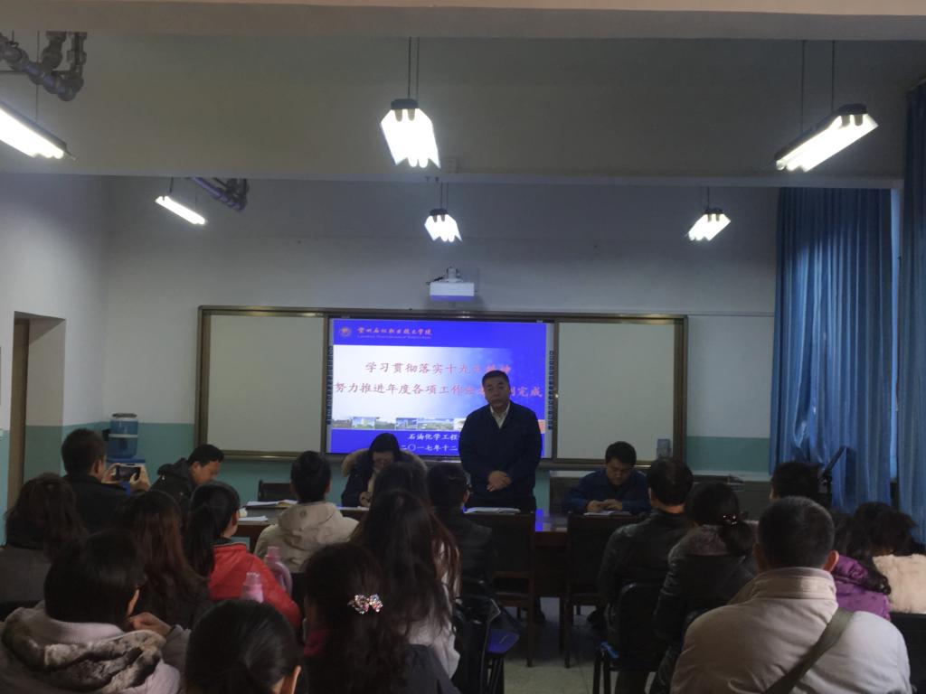 12月4日下午,石油化学工程学院于化工楼会议室组织全体教师深入学习贯彻落实十九大精神,以努力推进学院年度各项工作任务顺利完成,会议由学院党总支书记呼小洲主持。