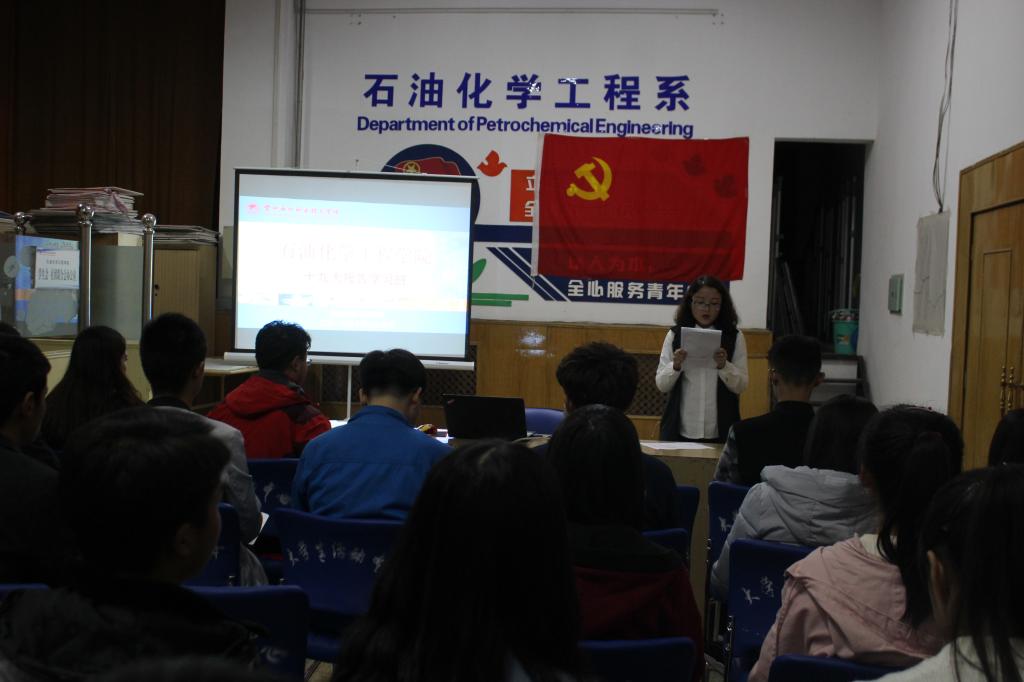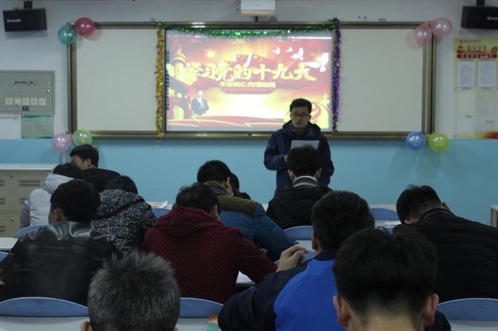 学校党委委员、组织(人事)部部长刘兴勤带领大家共同学习了十九大报告。他明确指出:党的十九大,是在全面建成小康社会决胜阶段、中国特色社会主义发展关键时期召开的一次十分重要的大会。承担着谋划决胜全面建成小康社会、深入推进社会主义现代化建设的重大任务,事关党和国家事业继往开来,事关中国特色社会主义前途命运,事关最广大人民根本利益。紧接着,刘兴勤从党的十九次全国代表大会简介及重要意义,十八届一中全会到七中全会重点回顾,十九大报告内容精解,做合格党员、不忘初心、永远跟党走等四个方面进行全方位讲述。期间,他重点对党的十九大内容和意义进行了详细阐述,并通过讲述自己在开拓就业市场时的亲身经历来鼓舞同学发扬我校优良传统,争做一名敢打硬仗、能打胜仗的新时代青年。