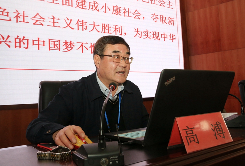 活动中,校长高溥首先为大家讲述了十九大报告的主题:不忘初心、牢记使命,高举中国特色社会主义伟大旗帜,决胜全面建成小康社会,夺取新时代中国特色社会主义伟大胜利,为实现中华民族伟大复兴的中国梦不懈奋斗。接着,他从党的十九大概述、全面解读十九大报告、十九大直抵人心的19句话等五个方面进行了阐述。围绕着十九大报告中的职业教育,他指出:现代化教育强国是中国梦的基础,我们要努力办出人民满意的教育;中国职业教育已走在了世界教育的舞台中央,我们高职院校应主动承担起应有的责任,积极响应国家号召,为一带一路、精准扶贫等项目,培养更多更优秀的高技能人才,贡献职业院校的力量,实现与周边国家文化经济共享、共同发展。最后,高溥要求参会的全体师生要认真学习、宣传和贯彻党的十九大精神,不断增强责任意识和担当意识;“听党话、跟党走、相信群众、依靠群众”,在各项工作中起到模范带头作用,共同努力、为党争光;希望广大师生牢固树立“终身学习”的信念,不忘初心、勤奋学习、苦练内功、夯实基础,争做新时代的有为青年,为决胜全面建成小康社会贡献自己的一份力量。
