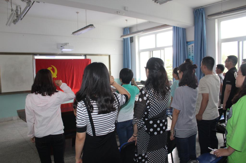 院长助理赵立祥传达了学校党委《关于开展纪念建党97周年支部主题党日活动的通知》文件精神,并带领大家集中学习了《习近平谈治国理政(一、二卷)》、《习近平新时代中国特色社会主义思想三十讲》的主要内容,主持了《习近平新时代中国特色社会主义思想》专题党课。全体党员现场观看了《红船精神——梦想的启航》微党课。最后,面对鲜红的党旗,大家高举右手庄严宣誓,重温自己对党忠诚的誓言,表达了为党的事业奋斗终身的决心。