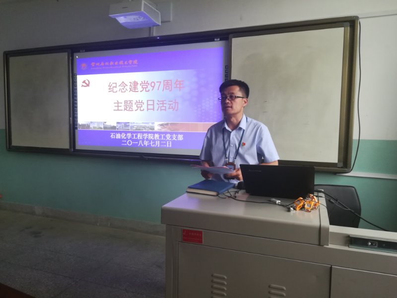 为庆祝建党97周年,深入贯彻落实习近平新时代中国特色社会主义思想和党的十九大精神,持续推进“两学一做”学习教育常态化制度化,7月2日下午,石油化学工程学院教工党支部在石化楼会议室组织开展了庆祝建党97周年主题党日活动。