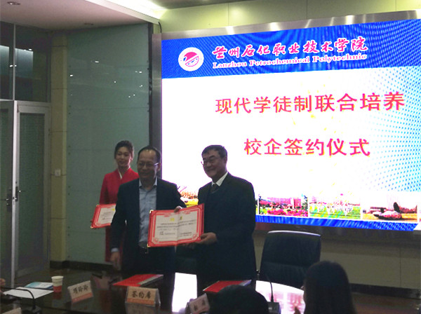 最后,Dato Mstsatejo、陈连财等在校领导的陪同下,到学校广汇厅举行校企合作签约仪式。仪式上,高溥为石油化工技术现代学徒制建设专家指导委员会企业委员颁发聘书。随后陈连财与现代学徒制班级学生就学习、生活方面进行了亲切的交谈,并与学生代表合影留念。