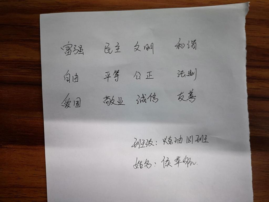 活动期间,学生干部有秩序的进入班级,同学们安静有序,积极、流利的回答着学生干部的提问。社会主义核心价值观是作为社会主义先进文化的精髓,它弘扬着我们的共同理想,凝聚着我们的精神力量,建设着我们额道德风尚。此次活动让学生们牢记社会主义核心价值观的理论,并深刻理解其精髓内涵,增强了同学们自信心、自豪感和成就感,充分额显示现代大学生的风貌和能力。