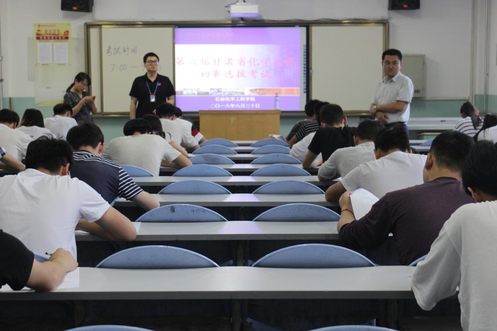 6月中旬在接到比赛通知后,学院积极筹备选拔参赛选手。石油化学工程学院分别在化工楼201、207等多个教室组织甘肃省第六届大学生化学竞赛理论初赛选拔考试,来自石油化学工程学院各班200余名成绩优异的学生参加了此次考试,最终确定40余名学生进入理论提升和实操训练。