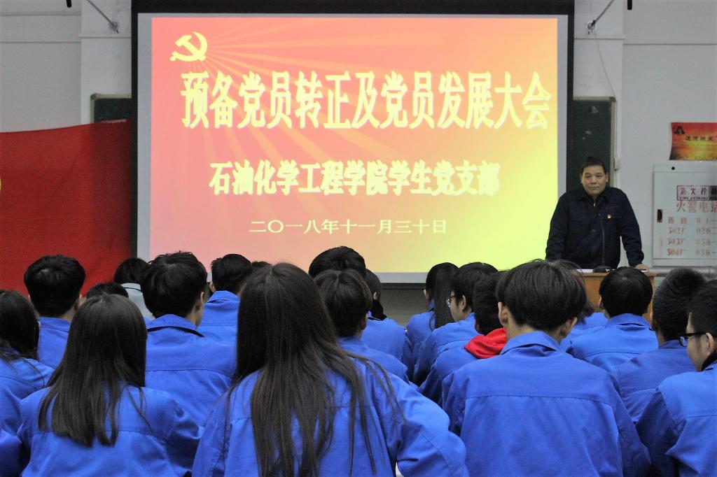 石油化学工程学院党总支于近日在西阶1开展了预备党员转正及新党员发展大会,教师党员、在校学生党员及新发展党员共90多人参加了大会。