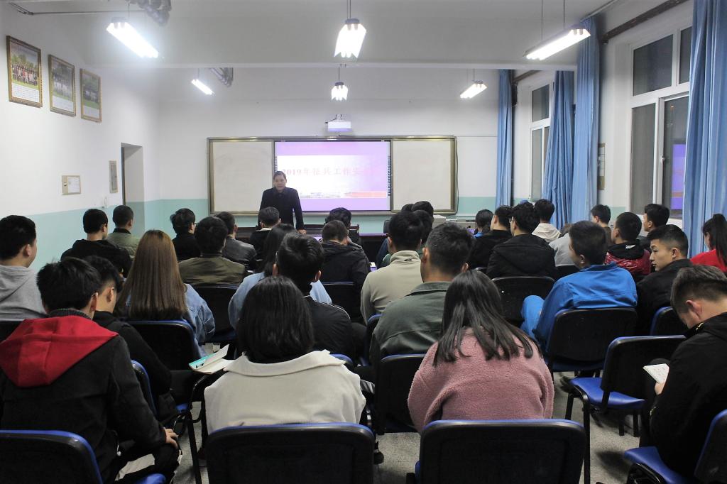 会议上,李胜泥老师首先就大家最为关心的征兵后就学、就业、经济补助、预征对象、身体条件、有关学费减免、落户要求、复学助学等问题做出了讲解。最后他强调:1.大学生入伍对于自身塑造和锻炼成才有重要意义并希望各班班长做好相应的宣传指导工作;2.从大学生中征兵是适应新时期国防建设和军队现代化建设的需要,是推进人才、科技强军的重大举措,是促进青年学生成长成才的有效途径;3.各班级要充分认识新形势下征兵工作的重要性,认真履行法律赋予的重要职责,切实加强领导,大力宣传《兵役法》,积极鼓励和引导高素质青年报名应征,积极推荐优秀大学生报名应征,确保圆满完成学校2019年征兵任务。