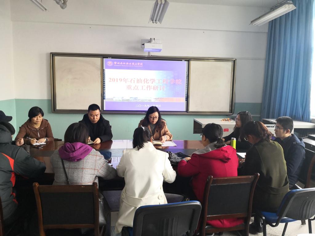 3月4日下午,石油化学工程学院组织召开教研室主任工作会议,传达学习《兰州石化职业技术学院2019年工作要点》,强素质、抓作风,担当作为,严格落实学校重点工作,把工作做细做实做出成效。会议由石油化学工程学院院长李薇主持。