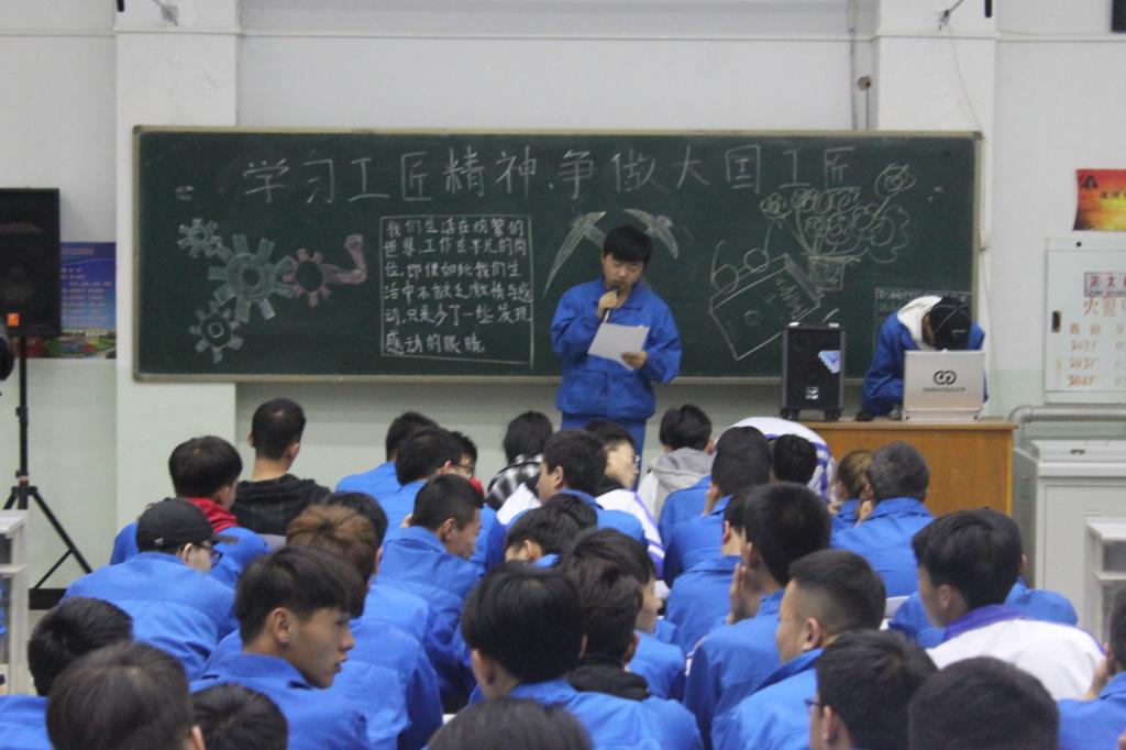 随着各班主持人的报幕结束,学生们集体唱共青团团歌,之后同学们围绕着以大国工匠精神为中心在上台展示精心准备的节目。同学们将查阅的资料与自己的想法、见解相结合,写出演讲稿与诗歌,并站在讲台上朗诵,讲述了一个个大国工匠的故事,从中提炼大国工匠精神,那些大国工匠们追求卓越,让人肃然起敬;他们以其聪明才智、敬业勤勉,奋斗在生产第一线,书写着劳动者的不平凡,为我们的时代、为我们的社会做出了突出贡献。同学们以激昂的歌声以及演讲展现出努力成为大国工匠的决心。