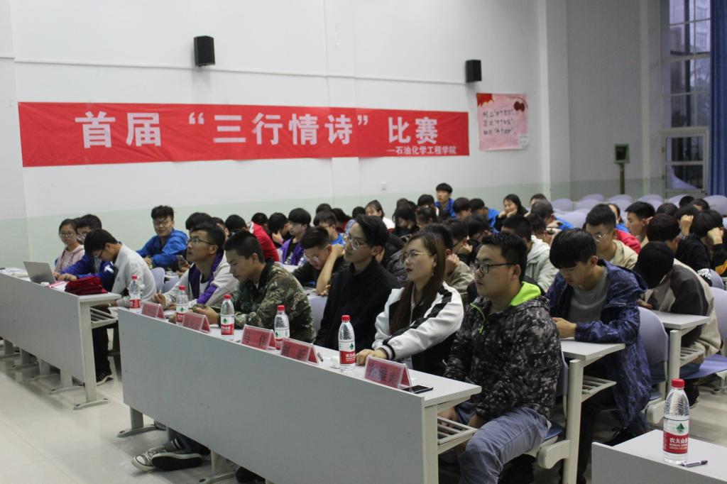 为了丰富学生课余生活、提高学生写作以及演讲能力。石油化学工程学院于近日在西阶三教室组织开展“三行情诗”比赛,本次比赛由团学干部担任评委,18位选手参赛。