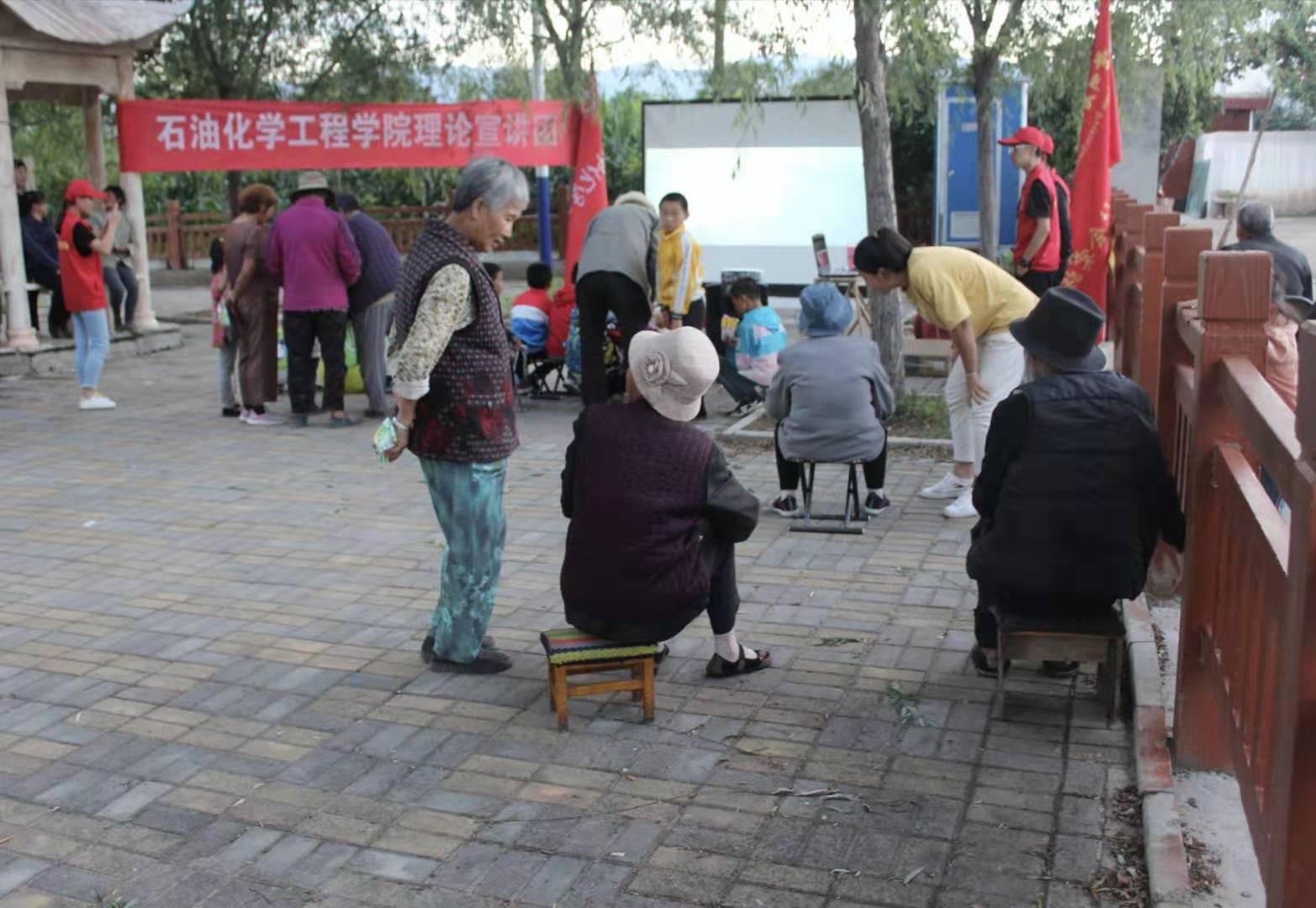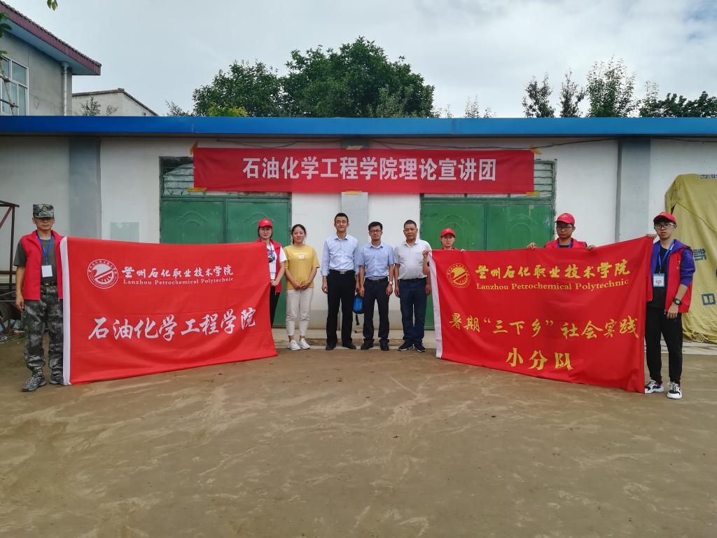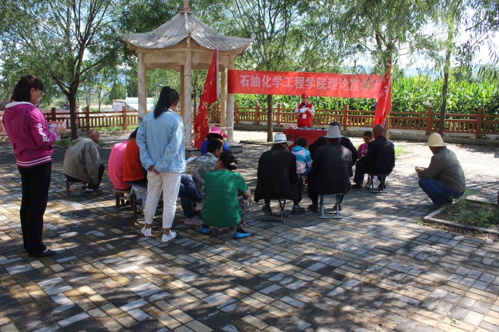 为深入学习贯彻习近平新时代中国特色社会主义思想和党的十九大精神,引导我院学生积极投身全面建成小康社会伟大实践,在实践活动中深刻感受新中国成立70周年所取得的伟大成就以及深刻领会习近平总书记在纪念五四运动100周年大会上的重要讲话精神,为新农村建设做好广泛宣传,并在实践中成长为有理想、有本领、有担当的新时代青年。2019年7月8日至7月12日,石油化学工程学院积极响应学校号召,成立“石油化学工程学院理论普及宣讲团”,组织师生赴兰州市榆中县龚家屲村组织开展了以“青春心向党建功新时代”为主题的暑期三下乡社会实践活动。本次活动由石油化学工程学院赵立祥、席满意、李胜泥和马克思主义学院叶婷四位老师带领7名优秀同学组成三下乡小分队,活动重点围绕习近平新时代中国特色社会主义思想和党的十九大精神,开展宣讲报告、学习座谈、调查研究、政策宣传、视频播放等形式多样的社会实践活动。
