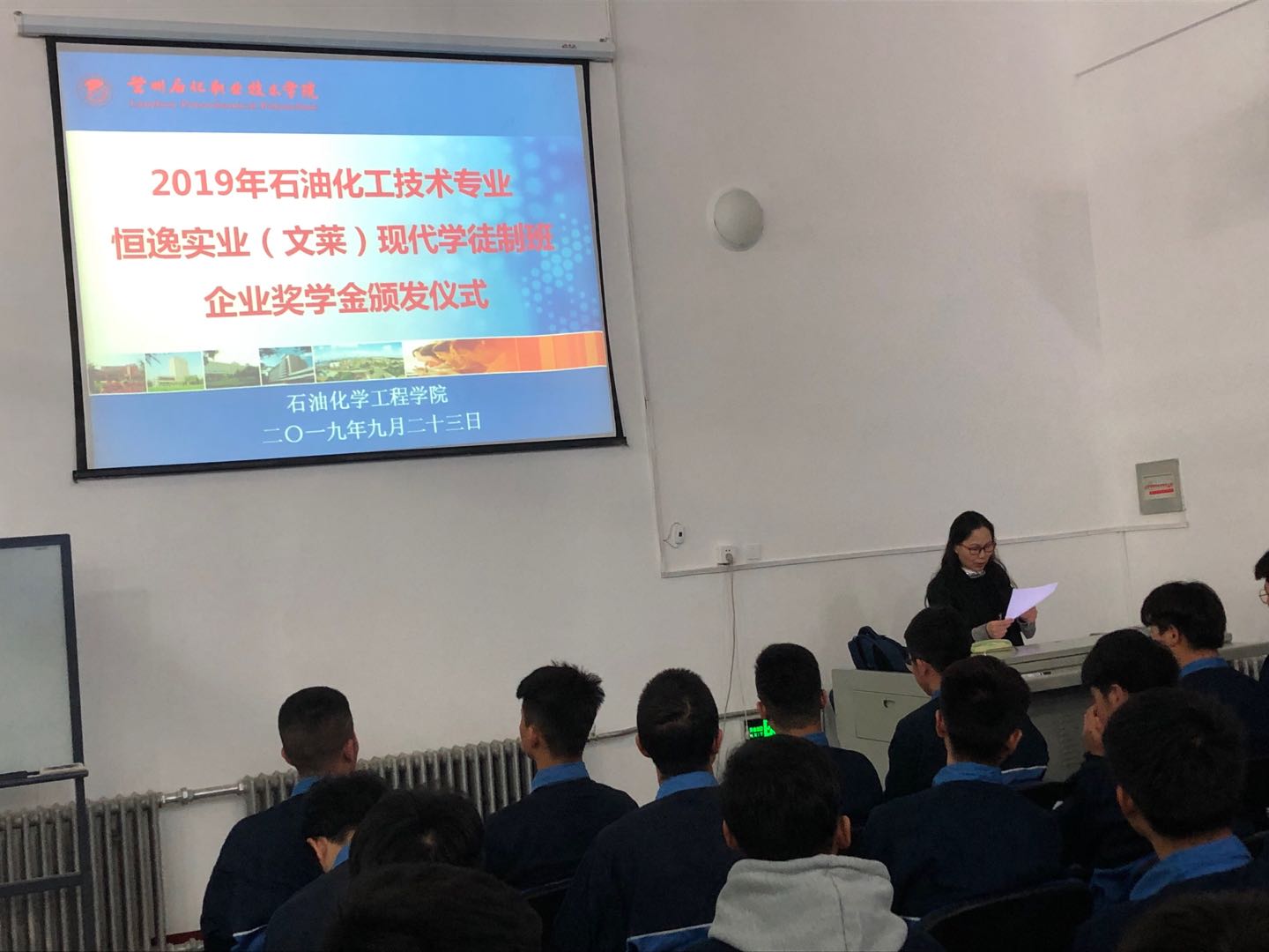 企业奖学金是由恒逸实业(文莱)有限公司出资设立的“恒逸学徒制班企业奖学金”,每年评选一次,我院与企业共同参与评选,用于奖励我院现代学徒制班学生中热爱专业、勤奋学习、品学兼优的优秀学员。赵辅珍副部长现场宣读了获得“恒逸现代学徒制班企业奖学金”学生名单,并给学生(学徒)介绍了恒逸实业(文莱)PMB石油化工项目建设进展,目前常减压蒸馏装置正式产出合格产品,为公司全面投入商业运营迈出了坚实的一步。最后现场解答了学生(学徒)的一些问题。