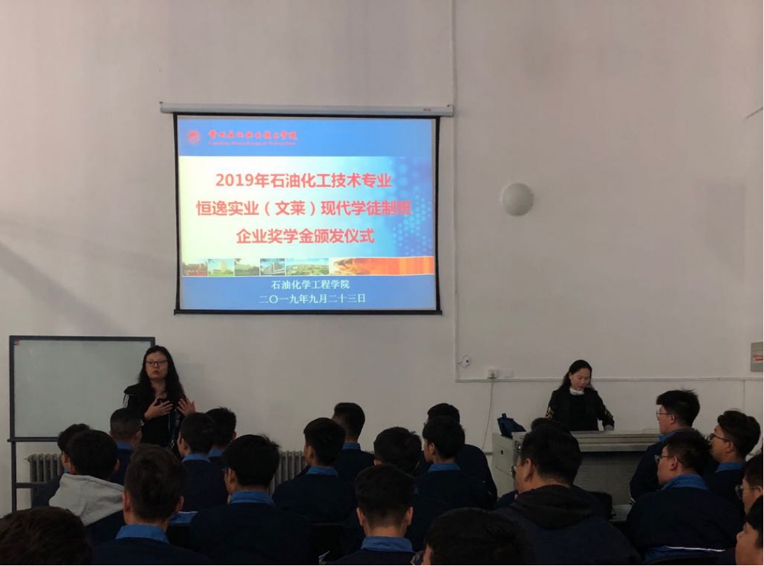 9月23日上午,“兰州石化职业技术学院·恒逸实业(文莱)有限公司现代学徒制企业文化宣讲暨企业奖学金颁发仪式”在第四工业中心实训基地举行。石油化学工程学院院长李薇、恒逸实业(文莱)有限公司人力资源部副部长赵辅珍一行两人出席本次会议并讲话,石化院相关负责人和教师,以及石油化工技术专业恒逸181和石油炼制技术专业恒逸191全体学生参加了本次会议。