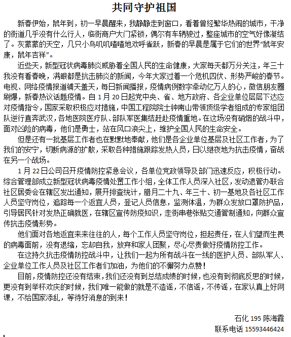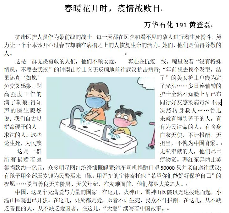 为激励同学们学习英雄事迹,声援抗疫一线的医护工作者,同时也为提高学生的写作水平,让宅在家里的同学们学会知恩图报,用笔参与抗“疫”工作的一线。石油化学工程学院朝露文学社组织开展“人间天使,勇往直前”网络征文大赛。学院部分学生参加本次活动。