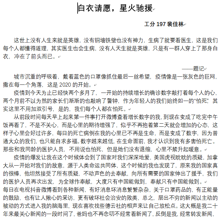 以笔为援,坚定信心,盼山河无恙、四海皆安!这次征文大赛,我院学子的参与热情之高出乎意料,同学们写出的每一个字都在向战斗在抗击疫情一线的平凡英雄们表达自己最崇高的敬意。在抗击病毒的第一线有许多的背影,医生们忙碌的背影,记者们奉献的背影,为医生送饭的各行各业人群感激的背影……在来稿的文章中同学们用自己的笔描述了在病毒和疫情面前,医护人员仍奋斗在第一线,甚至出现了多名医护人员感染的事件,面对危险,面对困难,白衣战士没有选择退缩,面对此次病毒,他们主动请缨与病魔搏斗,为的是控制疫情,为的是保障人民群众的健康,为的是捍卫社会安宁。他们集中火力,奔赴一线,全力以赴。参赛者们以个人独特的视角阐述了这群最可敬、最可爱的人儿。以文字的形式,为坚决打赢疫情防控攻坚战加油鼓劲。
