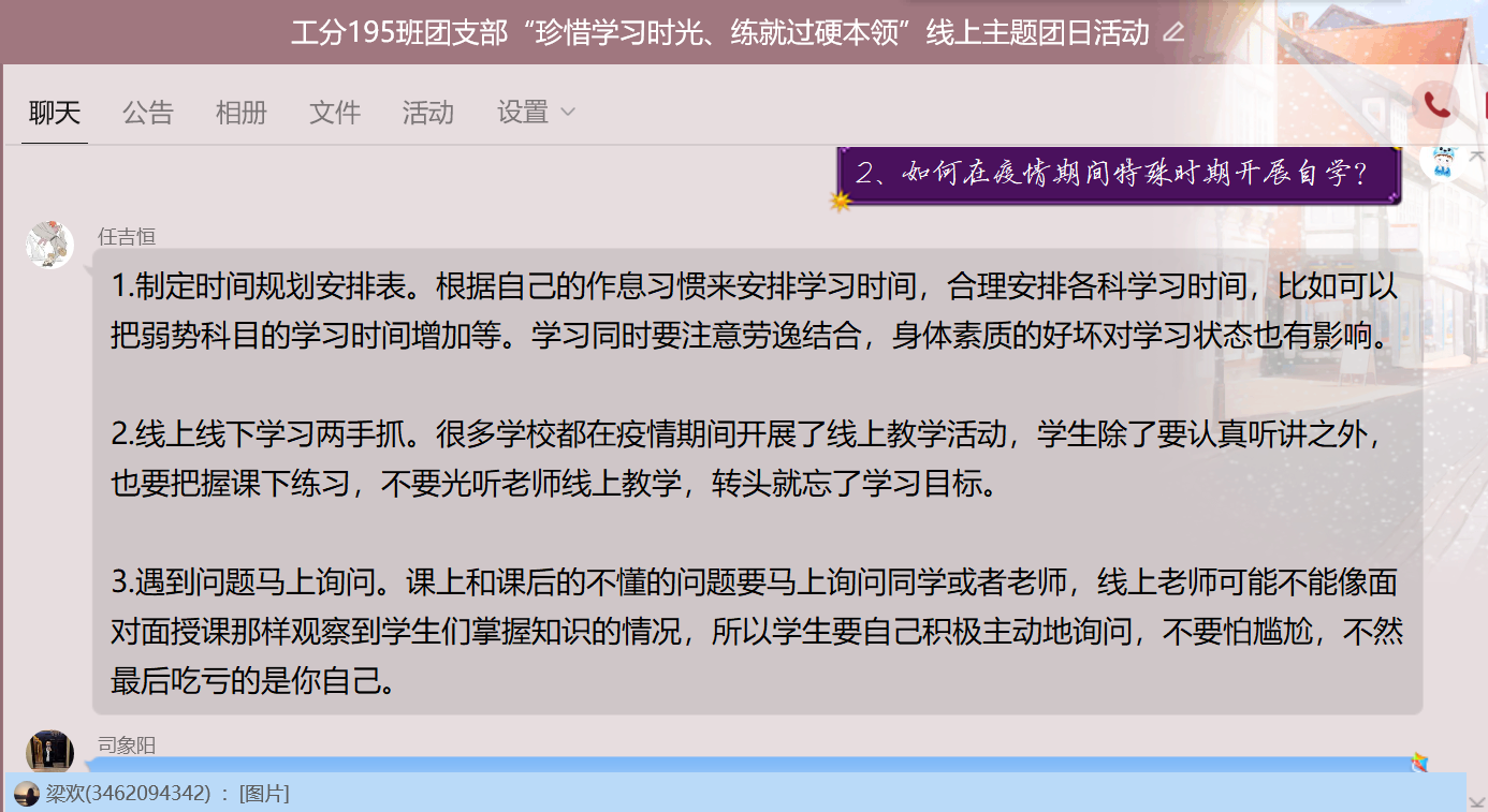 活动内容主要以线上自律学习方法交流、讨论;课前预习、课后模拟练习经验分享;如何在疫情期间特殊时期开展自学;合理安排居家学习、锻炼,保持身心健康等内容为主导。具体要是,唱团歌(会议记录中体现,线上团日活动可根据现场情况自定);对应内容开展丰富的线上演讲、讨论。