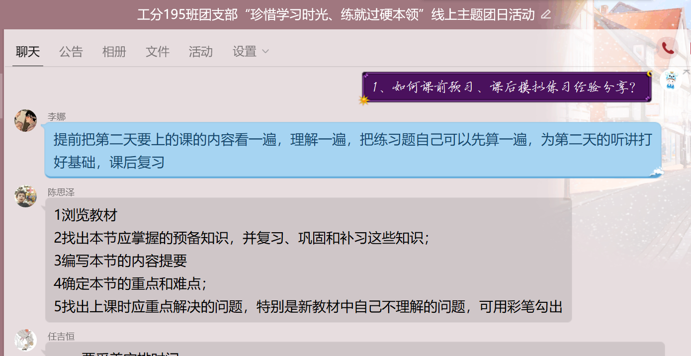 为有效引导团员青年线上自律学习练就过硬本领,认真学习专业技能理论知识。石油化学工程学院于4月19日组织19级各团支部组织班级共青团员通过QQ群、微信群或者其他网络媒体开展团支部“珍惜学习时光、练就过硬本领”主题团日活动。活动旨在开展居家学习方法发言、讨论,在奋力打好防疫战的关键时刻以更坚定的信心、更顽强的意志,全力提升综合素质。