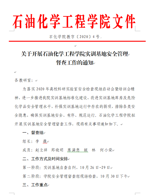 为落实2020年高校科研实验室安全检查现场启动会暨培训会精神、省教育厅关于实验室安全工作的部署和学校相关要求,进一步推进我院实训基地标准化建设,改进实训基地库房及危险化学品安全管理水平,补强实训基地运行中存在的弱项,排除各类安全隐患,确保实训基地安全、有序、规范运行。10月30日下午石油化学工程学院组织开展了实训基地安全管理专项督查工作。