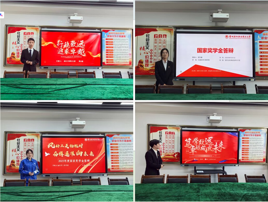 秉持“公开、公平、公正、择优”的评选原则,经前期个人申报和学院评审严格筛选,共有9名候选人入围本次答辩。答辩伊始,主持人宣读国家奖学金答辩规则及评审标准,随后候选人分别从个人基本情况、思想表现、学业成绩、技能大赛、社会实践、志愿服务、宿舍卫生等方面进行了全面展示。他们中既有专业成绩名列前茅的“学习标杆”,也有在技能大赛中取得突破的“技术专家”,更有长期投身公益服务的“志愿先锋”。候选人自信从容的陈述、扎实过硬的成绩和心怀家国的情怀,赢得了现场评委和观众的阵阵掌声。